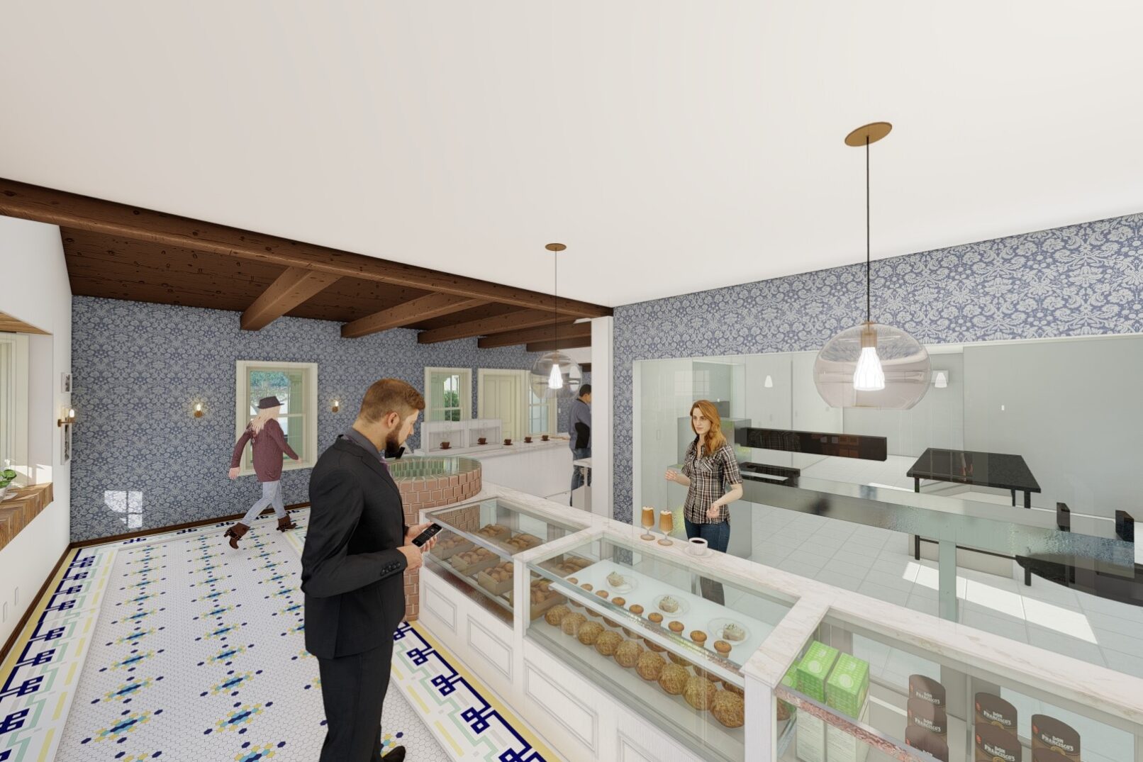 Historic restorations and interior design to an original 1800s structure for a new bagel shop and cafe. Completed in 2023.
